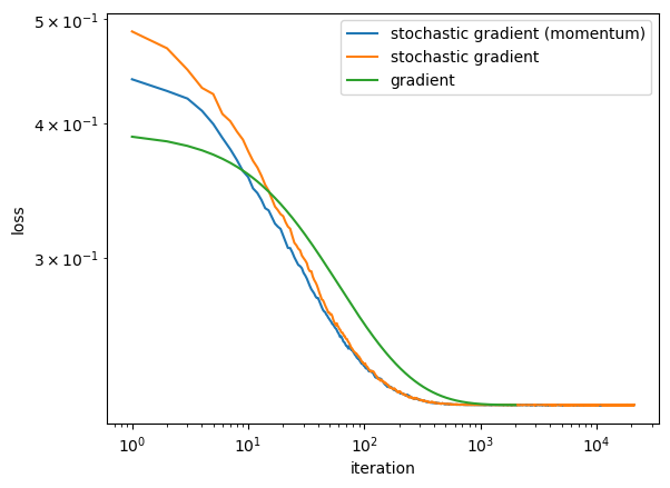 Based on the graph, stochastic gradient descent with and without momentum tends to converge at a rate faster than standard gradient descent, but these random algorithms can “bounce around” near the good solution. Standard gradient descent might need more epochs to find a good solution, but quickly “settles down” once it finds it.