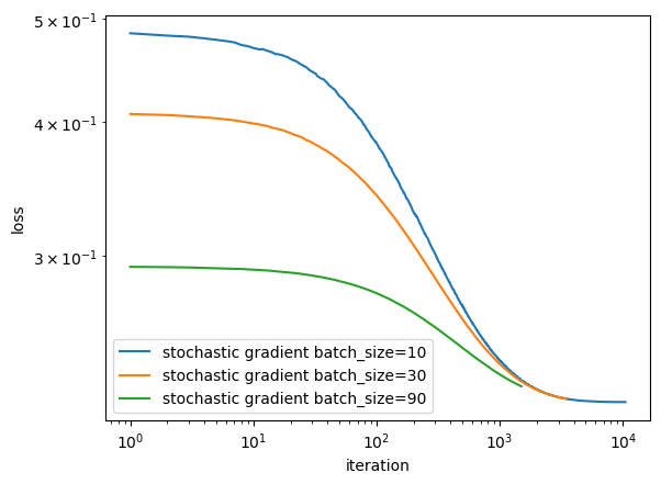 Compare the there lines with different batch size, the green line with batch_size = 90 seems to converge faster then the other two line.